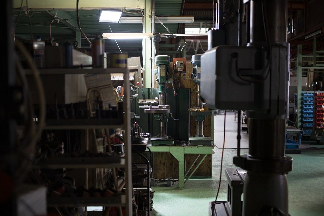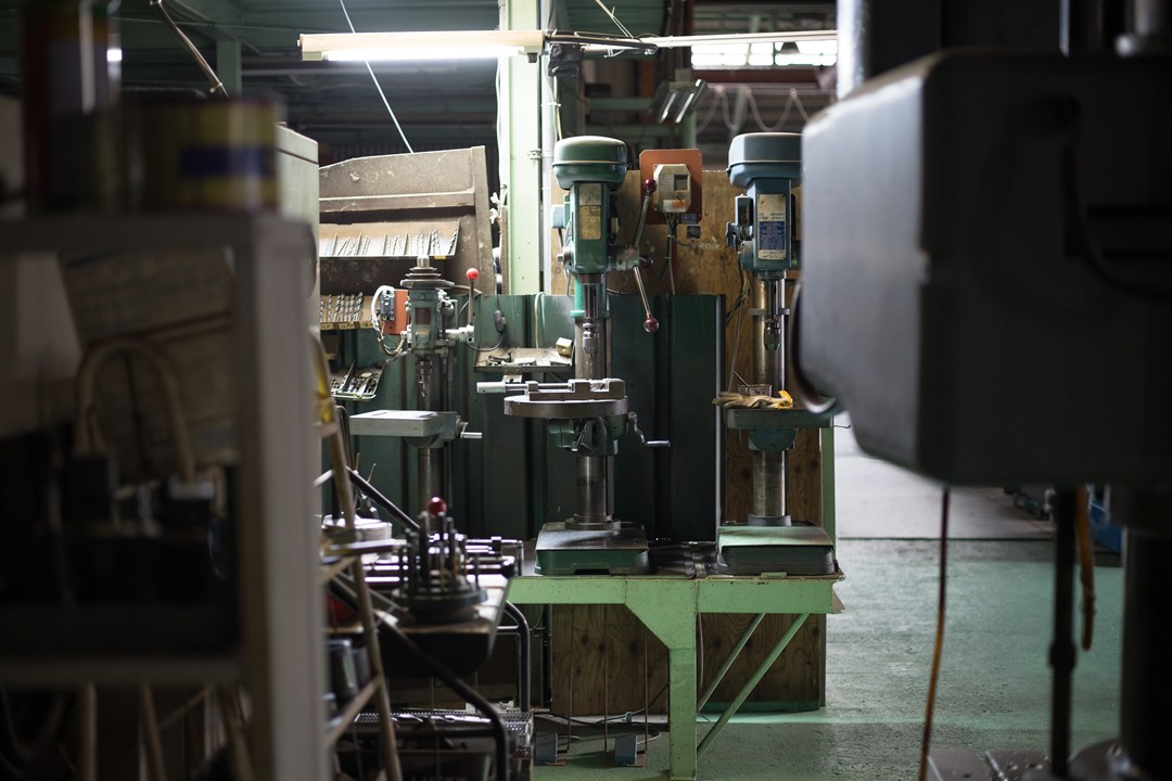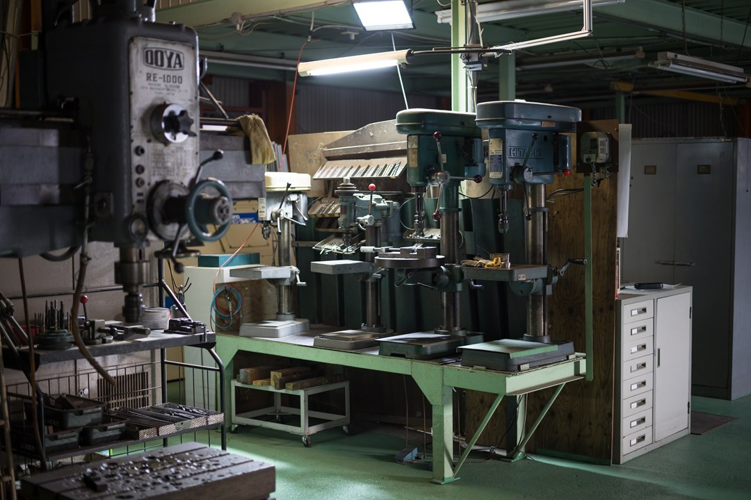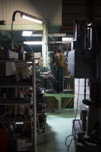 一番左は、タッピングマシーンで、タップ(ネジ)加工をします。このタッピングマシンでネジが断たない大きさの場合は、右の2台も、逆転できるように改造しているので、このどちらかでタップを立てます。更に、この2台でも断たない場合は、写真手前に写っている、ラジアルボール盤でタップ(ネジ)加工をします。
