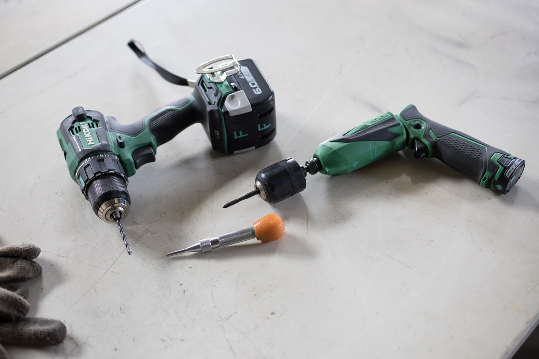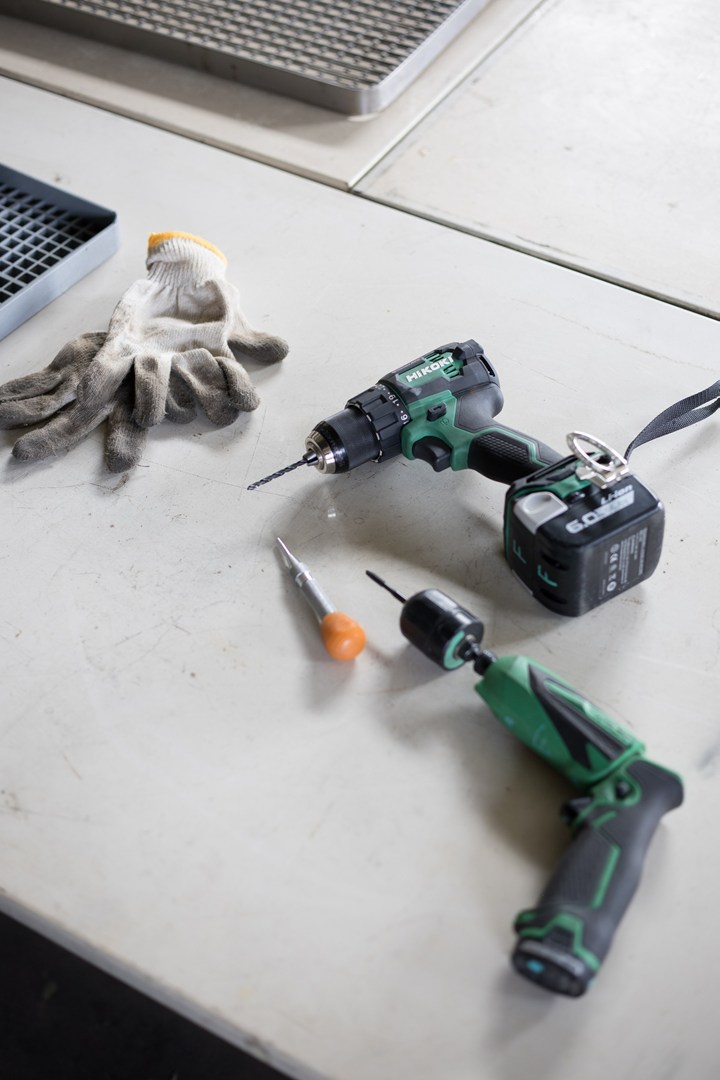 電気ドリルで下穴開け加工。朝方、水溜りが凍ってた。