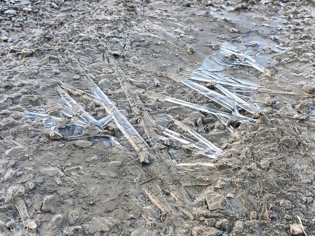 ↓は、お客さんの工場内の駐車場で見つけた、水溜りが凍っていた。