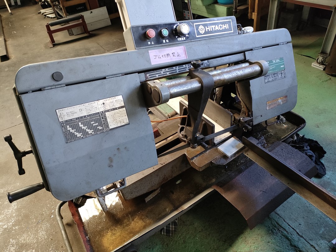 バンドソーで、ステンレスのフラットバー(ホット材)を切断作業。