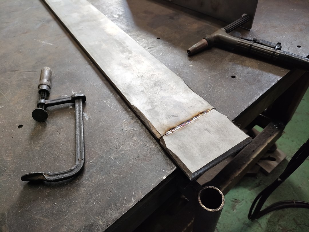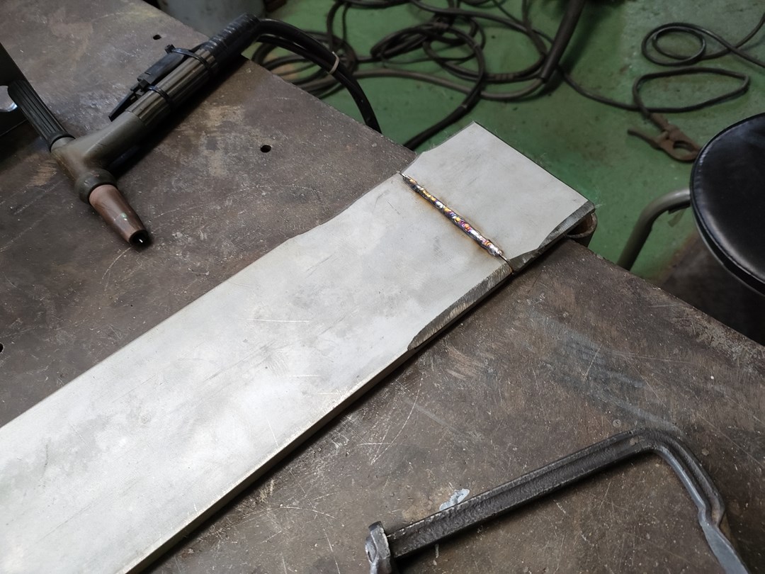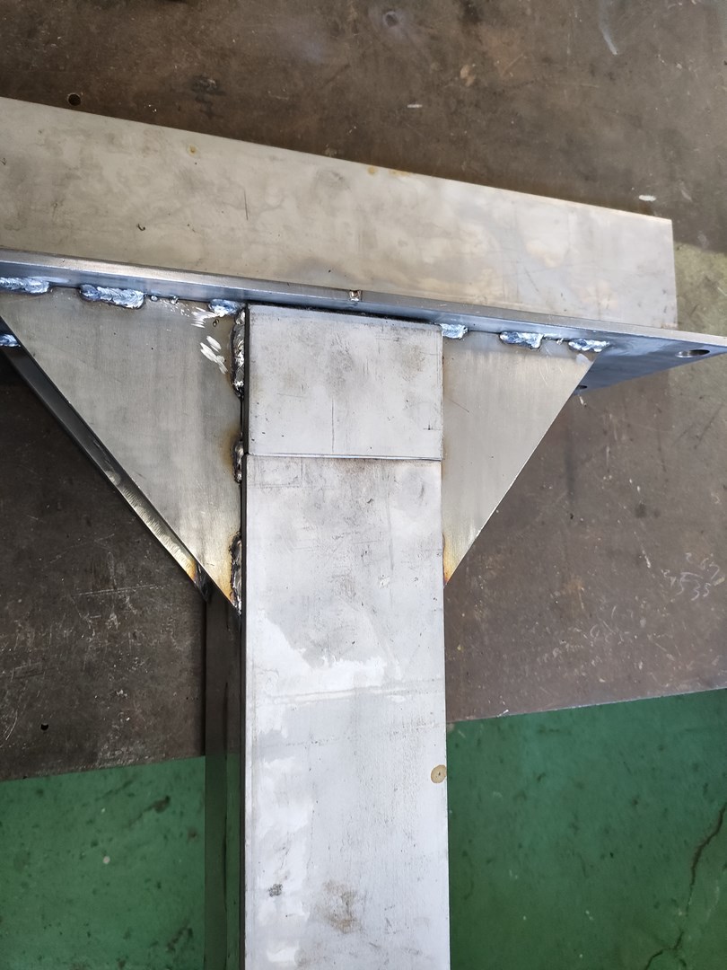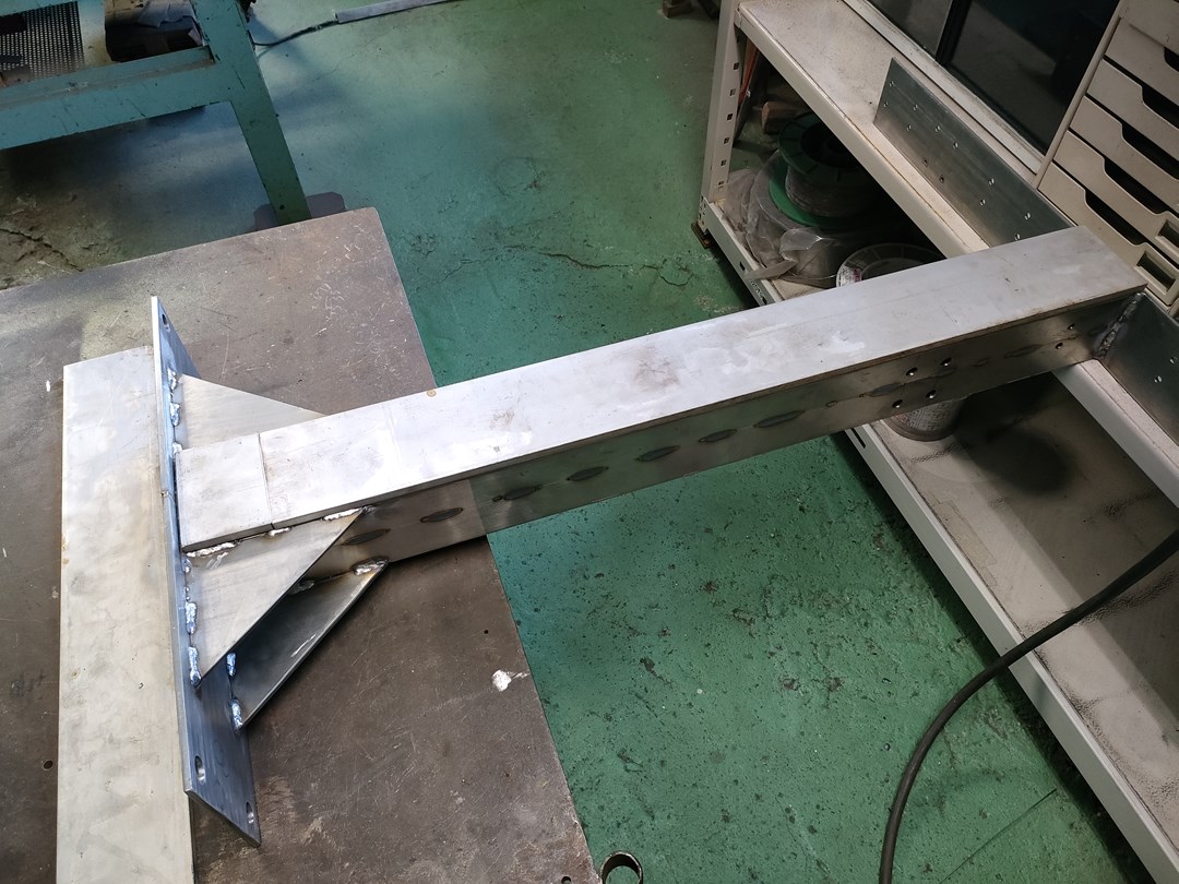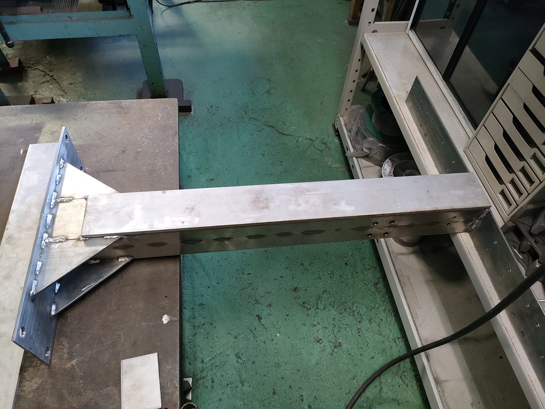 切断したフラットバーは、↓の場所に溶接する為に切断しました。これは、角パイプの強度を上げるために、背面にフラットバーを溶接しました。