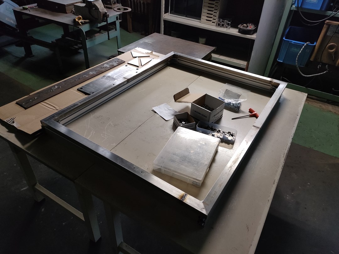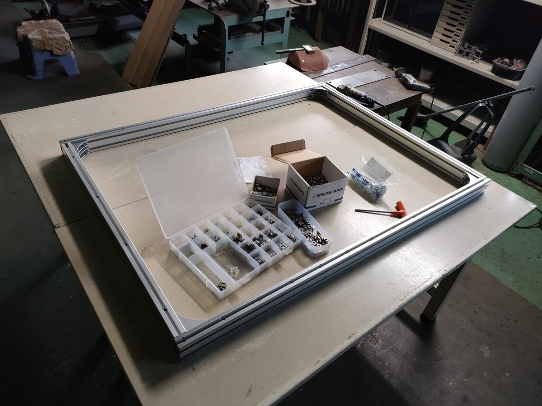 アルミフレームを組みます。掲示板の外枠になります。こう言うのは、新品を使います。