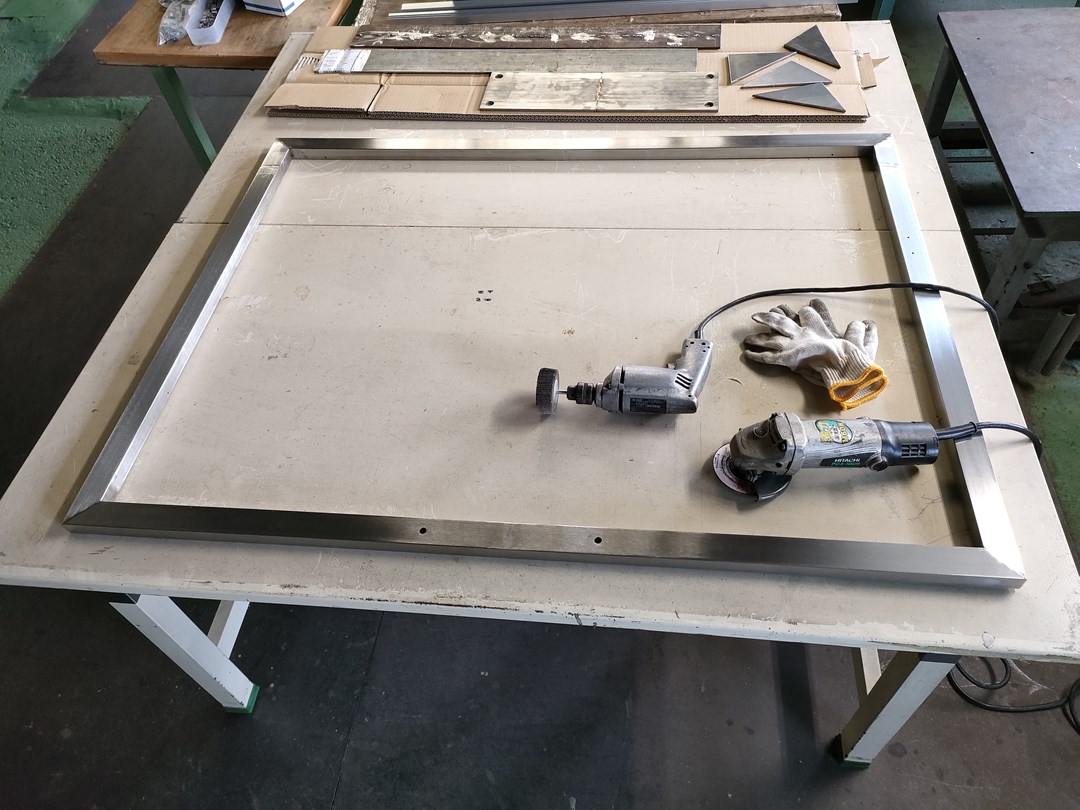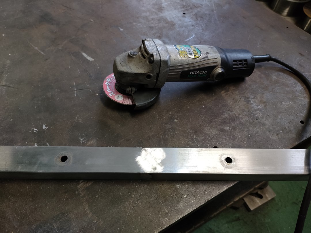 ステンレスのフレームを本付け溶接をして、グラインダーでフラットにします。