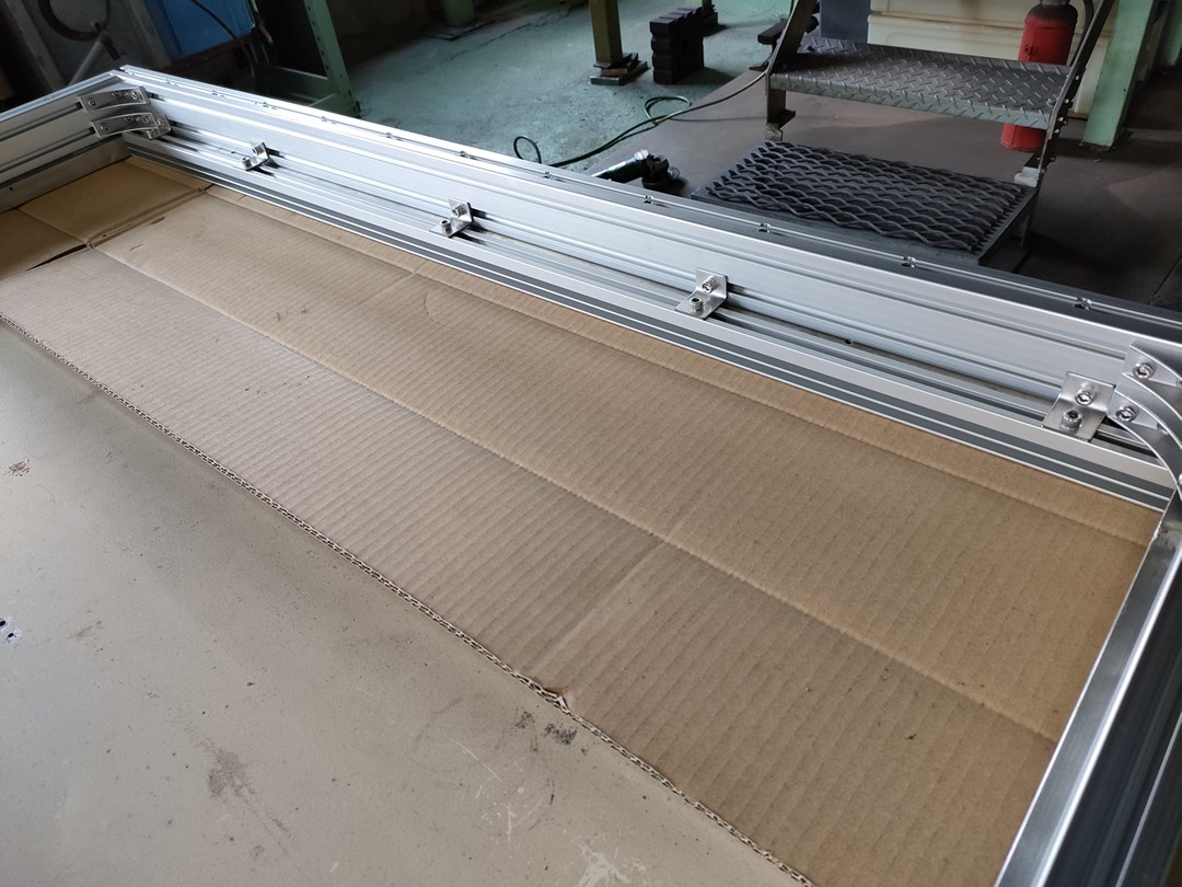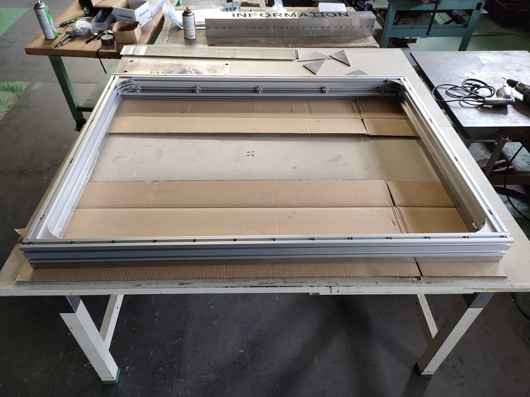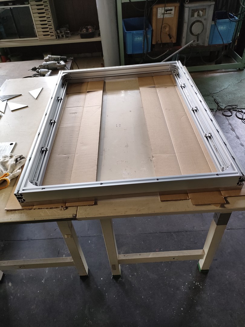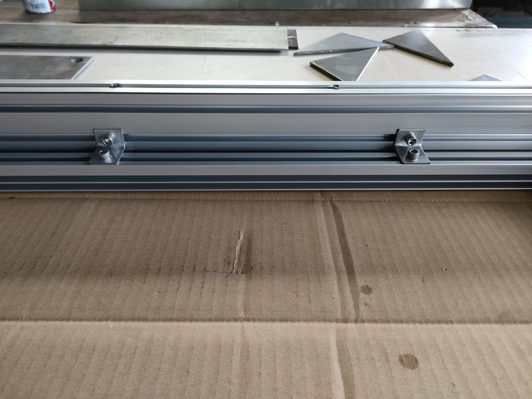 ステンのブラケットで、アルミフレームとステンレスの角パイプを組立。