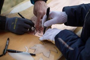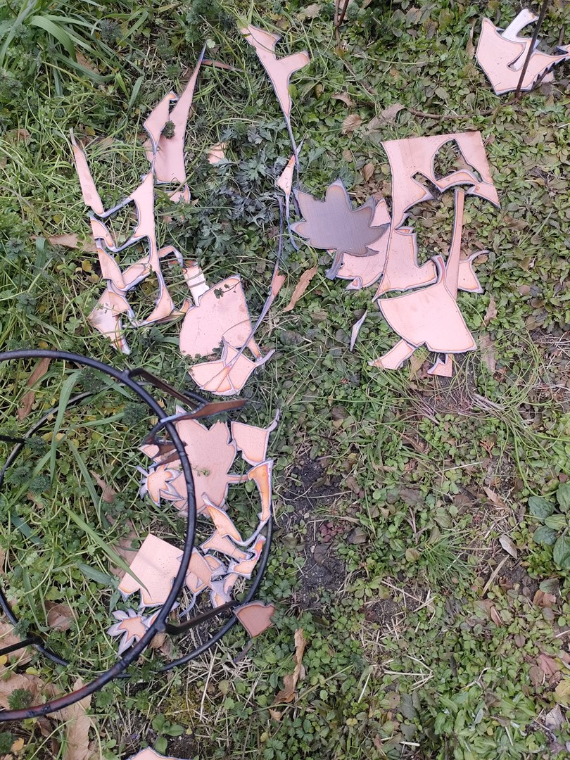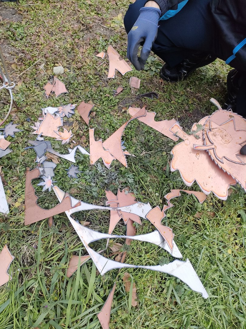 プラズマで切断したのは、銅メッキの板。これを、葉っぱの形状に切断しました。