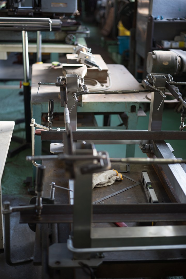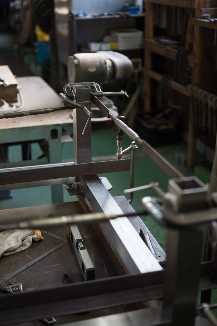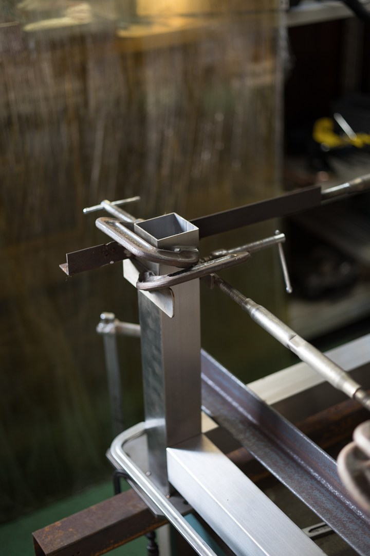 ステンレスのフレームを仮付け溶接する準備をしている所