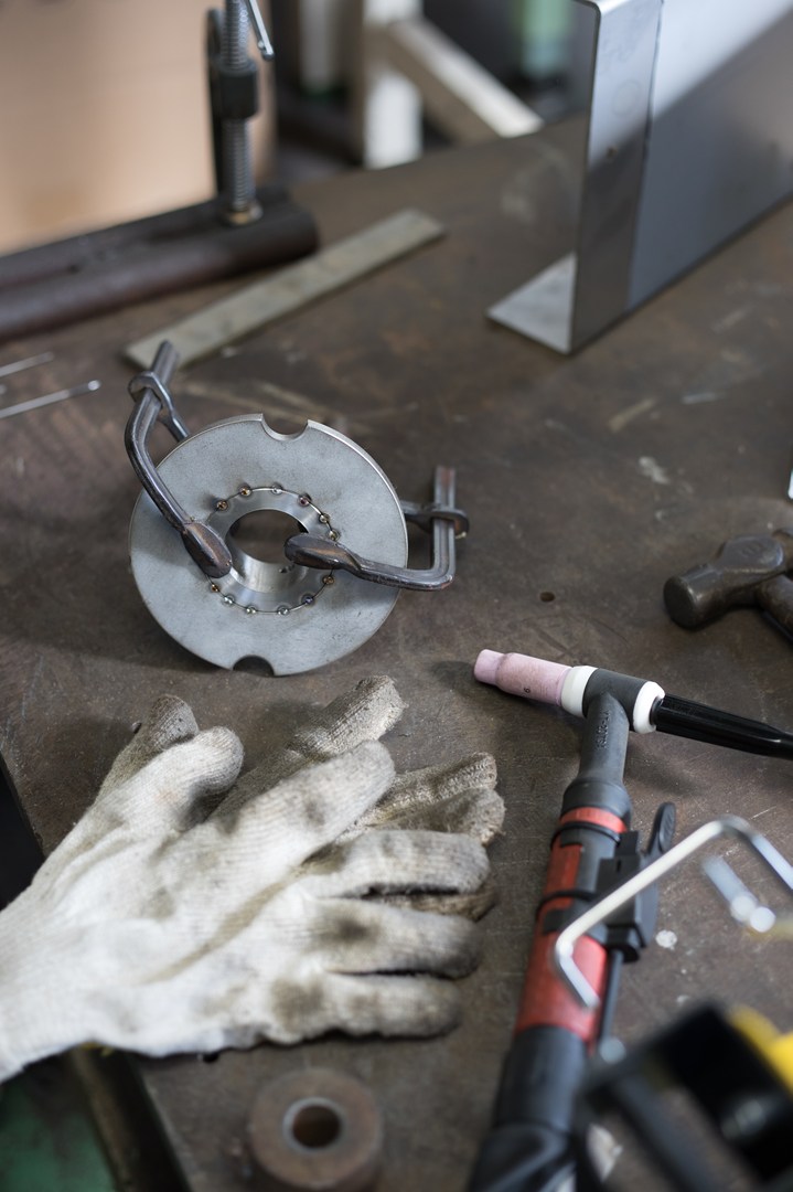 ステンレスの材料や部品を溶接。先ずは、仮付け溶接。