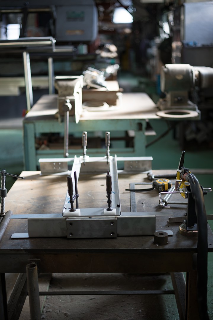 傷が付かないように、ステンレスの表面には樹脂を置いて、シャコマンで締めて固定。その後、TIG溶接で仮付け溶接。