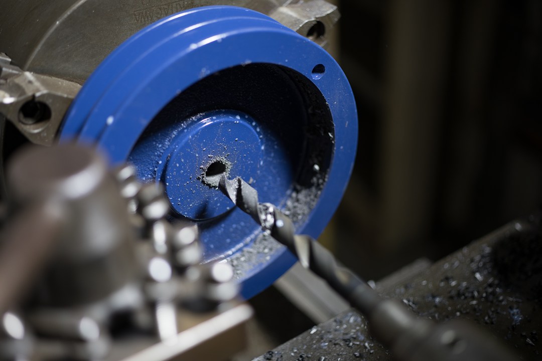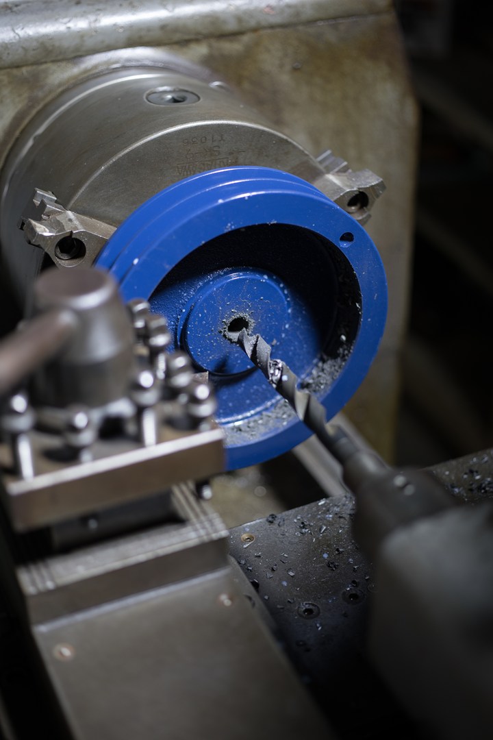 Vプーリーの内径加工で、先ずは小さい穴をあける作業。