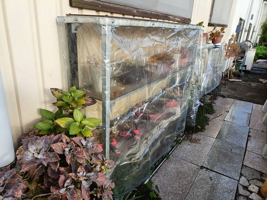 最近、朝方が10℃を下回り5℃前後になってきたみたいなので、屋外管理している植物達の棚の冬支度でビニールを取付けました。