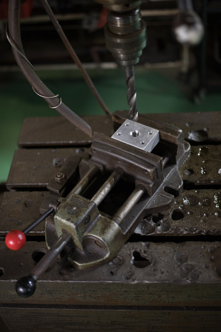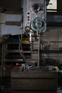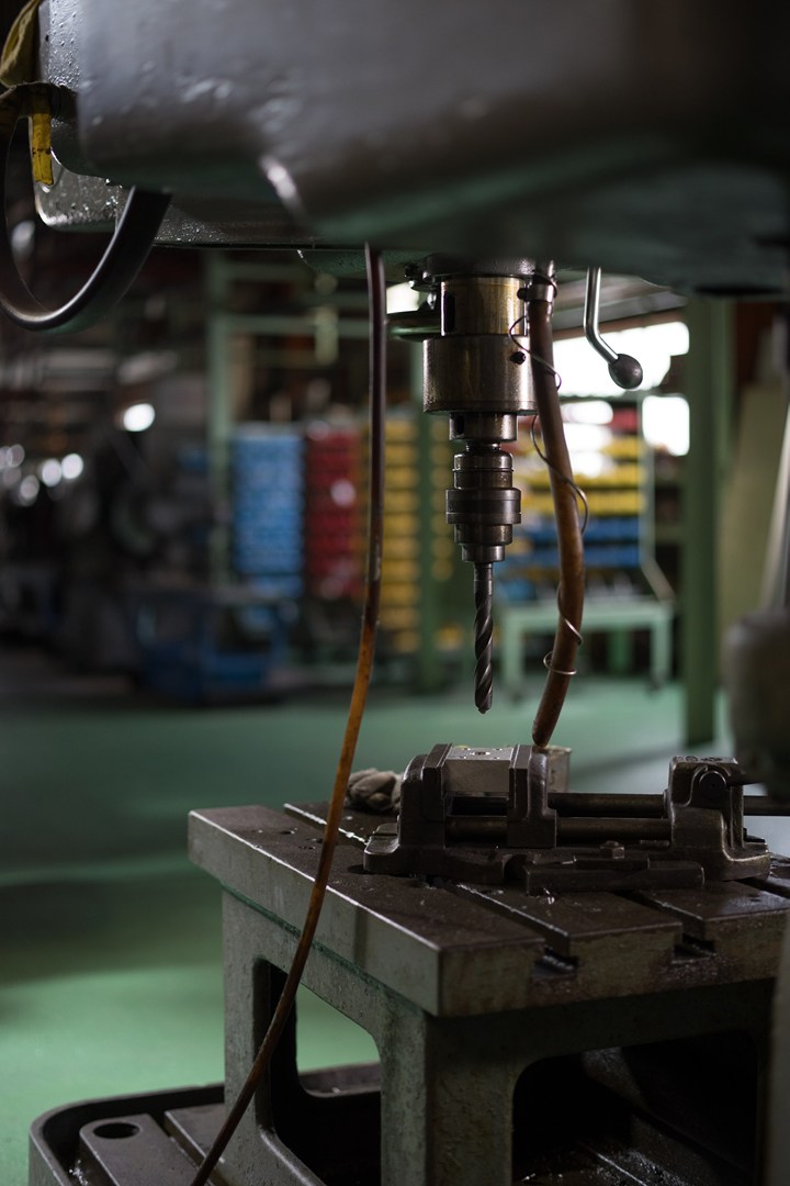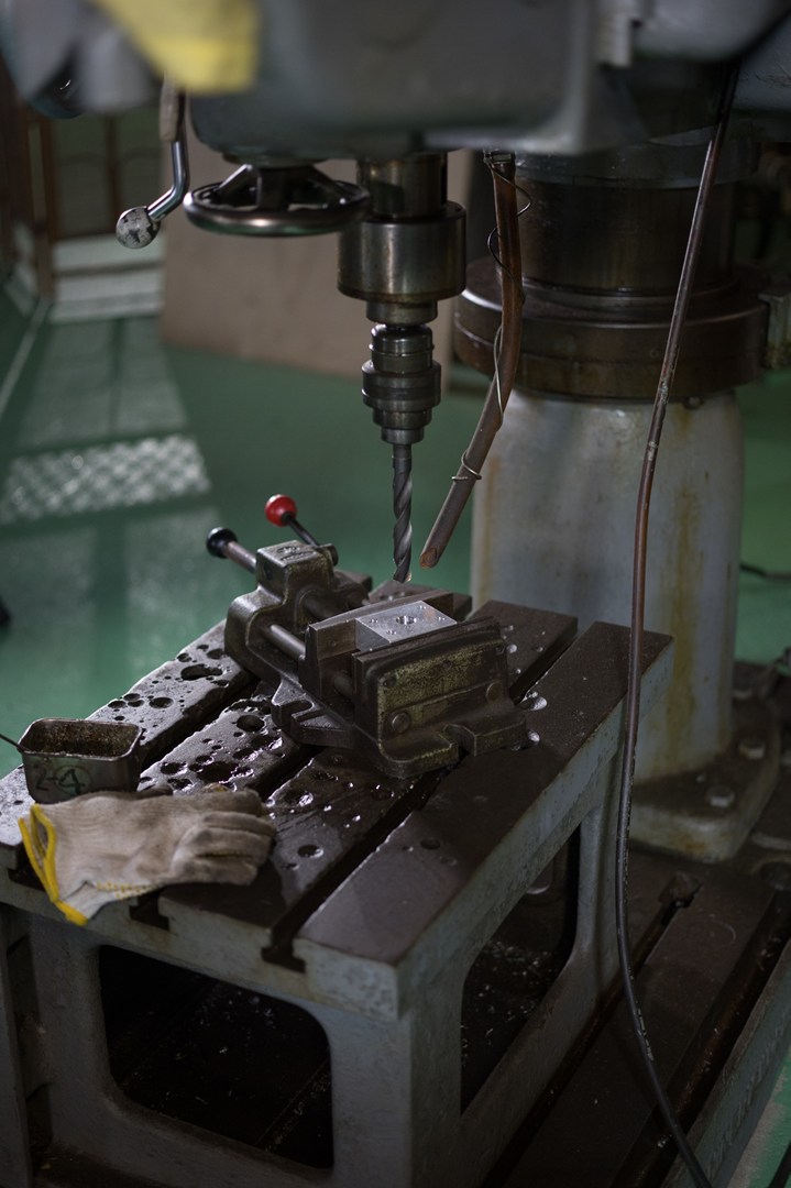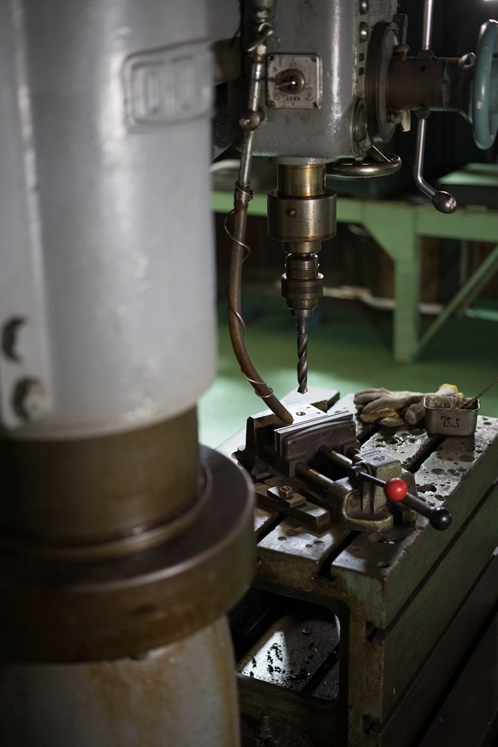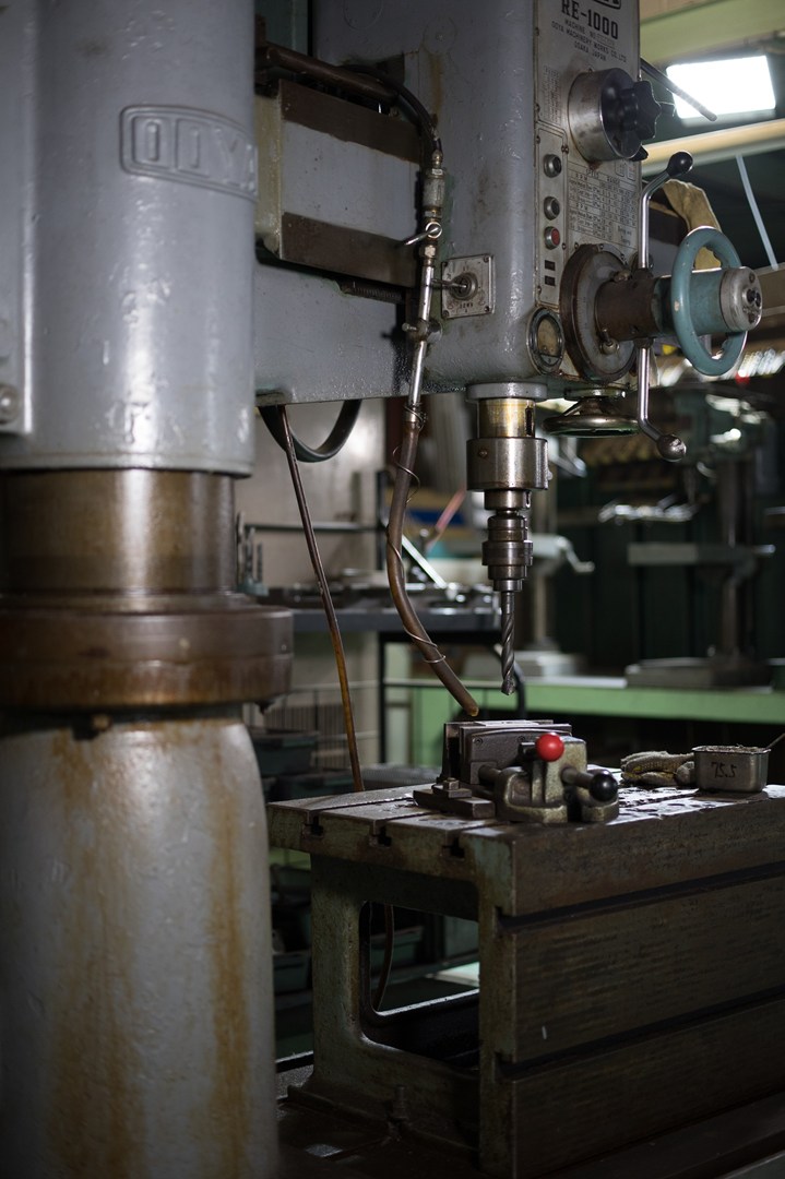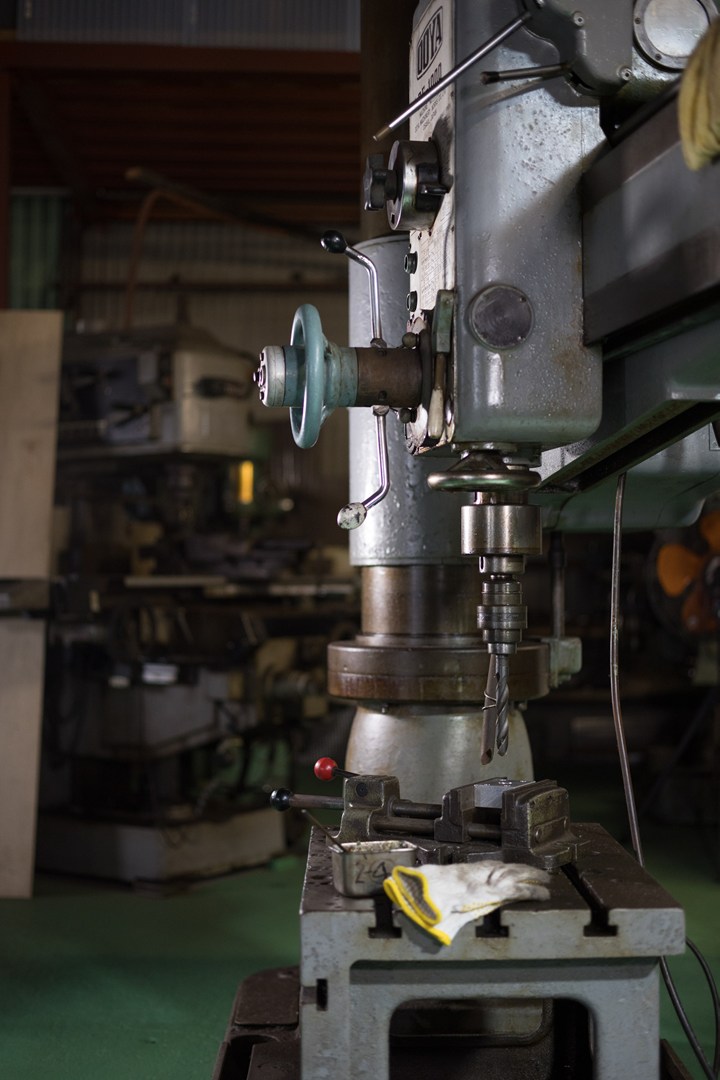 ラジアルボール盤で、アルミに穴をあけてる作業
