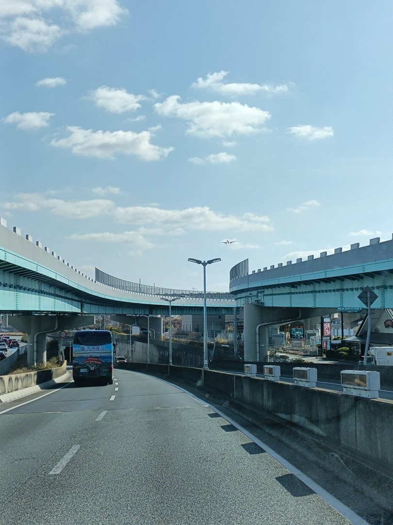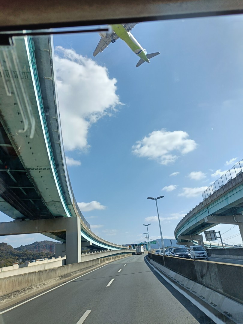 その道中。都市高速を通るのですが、友達と、久留米に住んでると、飛行機をこんなに大きく見る事ないよねぇ~と、進路方向から飛んでくる飛行機を見て思いました。私は助手席なので、飛行機を撮影!