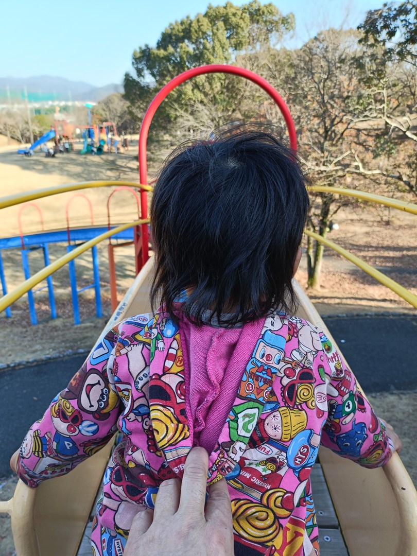 子供の指が挟まった。と言う事故とかもニュースで見た事が有るので(ココの滑り台ではありません)、孫を足にのっけて、私は滑りまして・・・